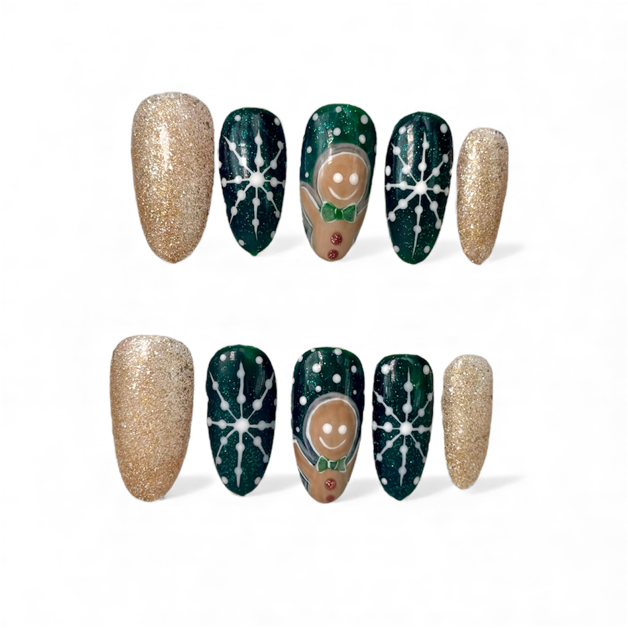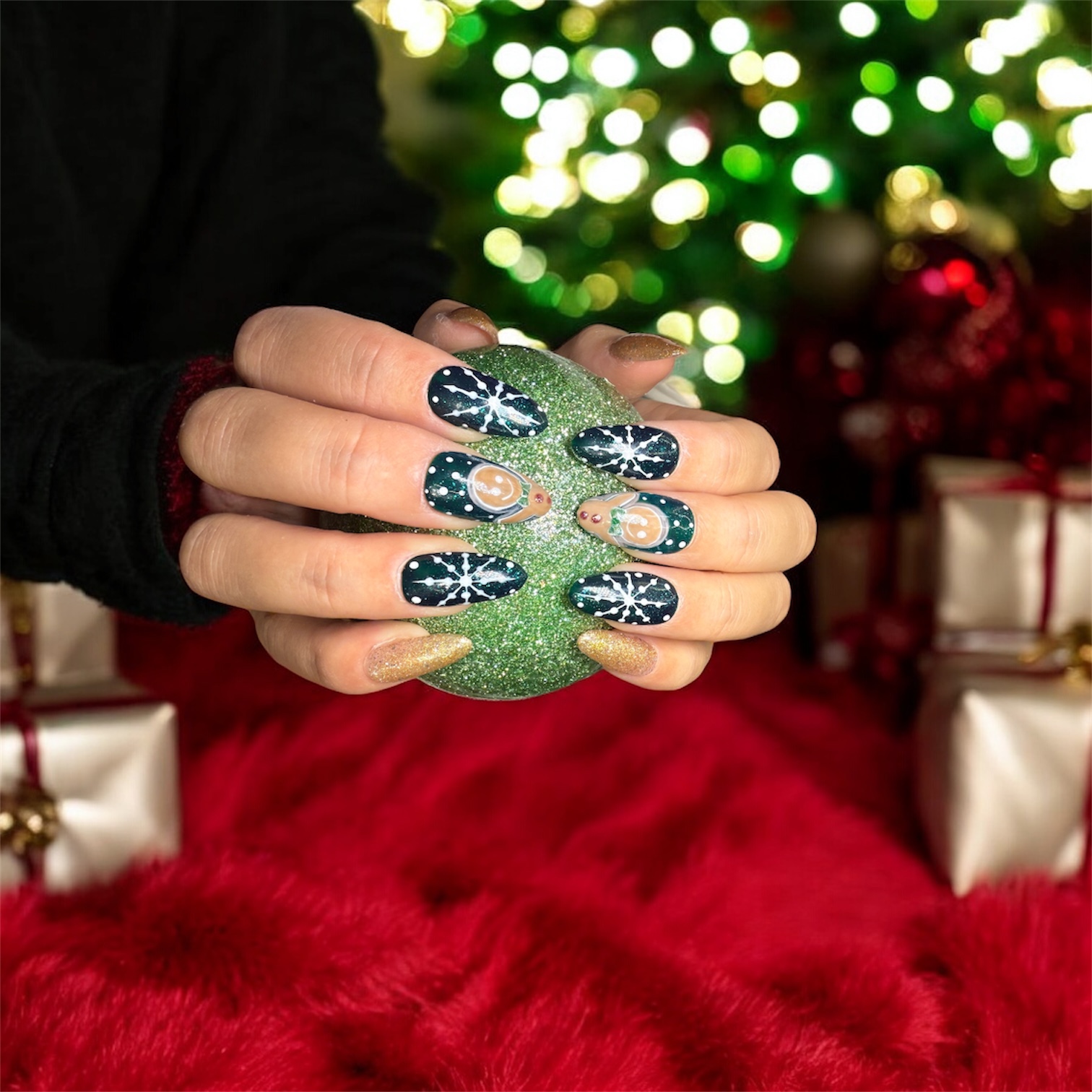 El verde profundo se une a detalles de copos de nieve y al clásico muñeco de jengibre, creando un estilo divertido, festivo y lleno de personalidad.
