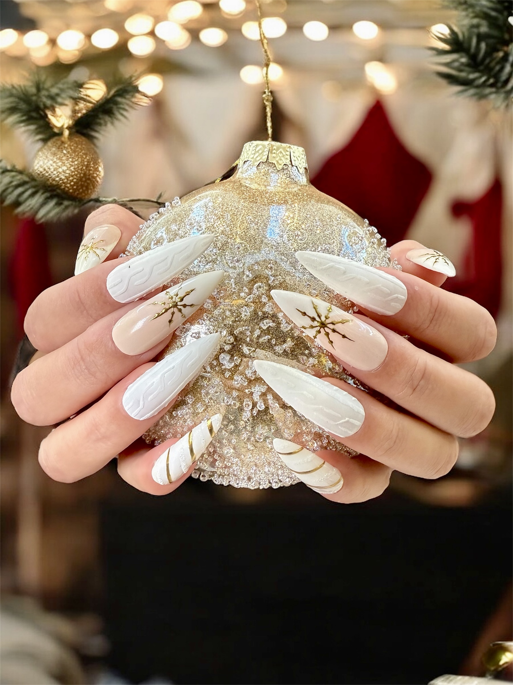 ✨ Snowlight Elegance ✨ Un diseño exclusivo inspirado en la pureza del invierno y el brillo dorado de la Navidad.Cada uña está hecha a mano con detalle, combinando textura efecto suéter y delicados acentos dorados para un look elegante y sofisticado.Perfectas para brillar en esta temporada festiva ❄️💫
