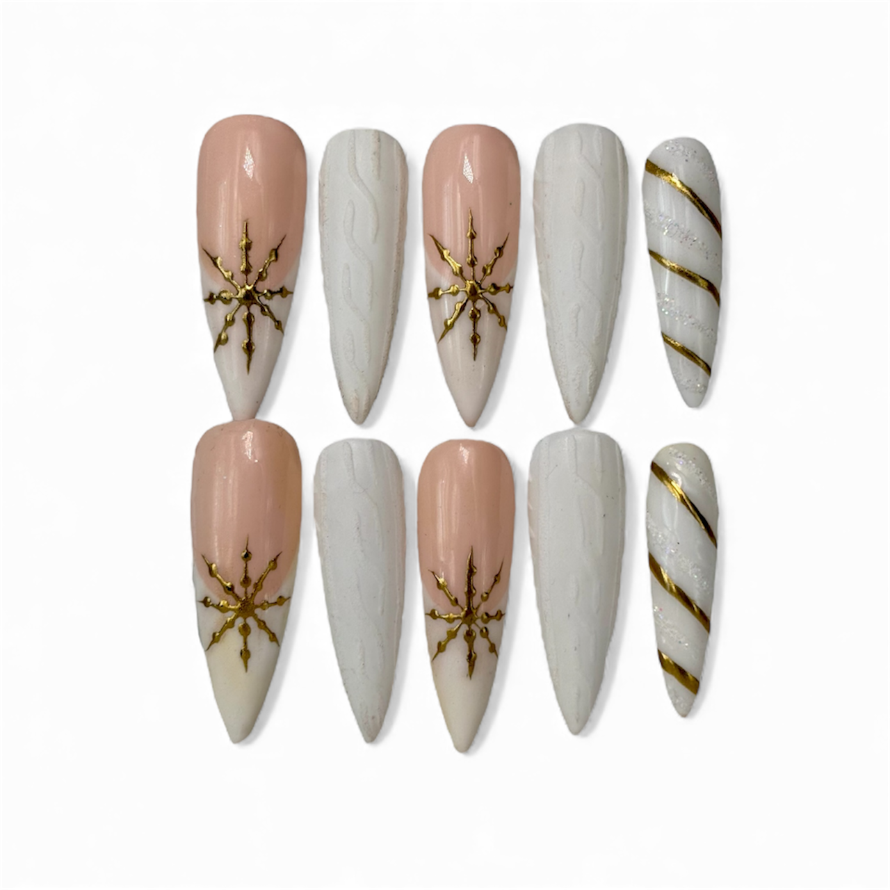 Cada uña está hecha a mano con detalle, combinando textura efecto suéter y delicados acentos dorados para un look elegante y sofisticado.